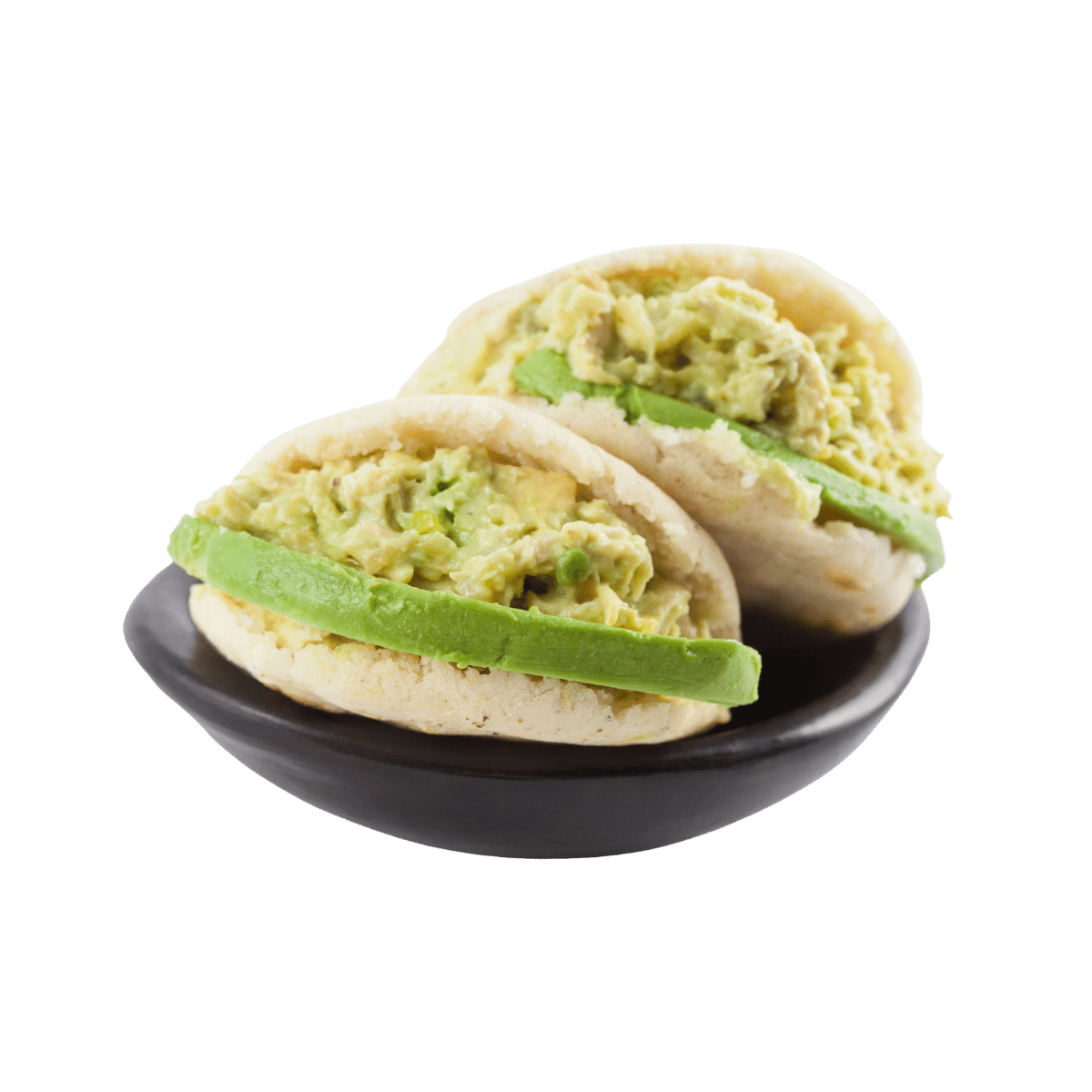 Arepa rellena de pollo, verdura y aguacate.